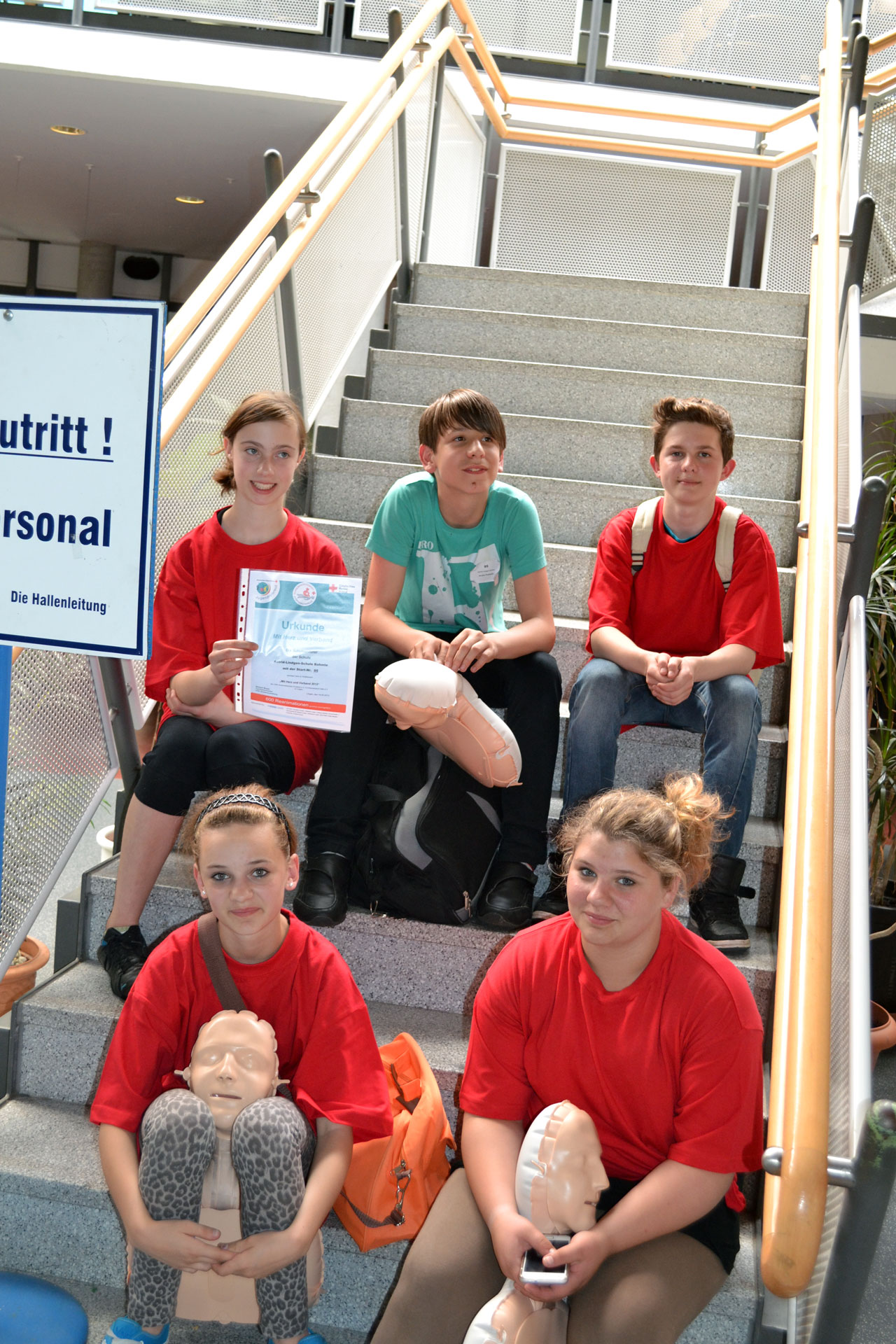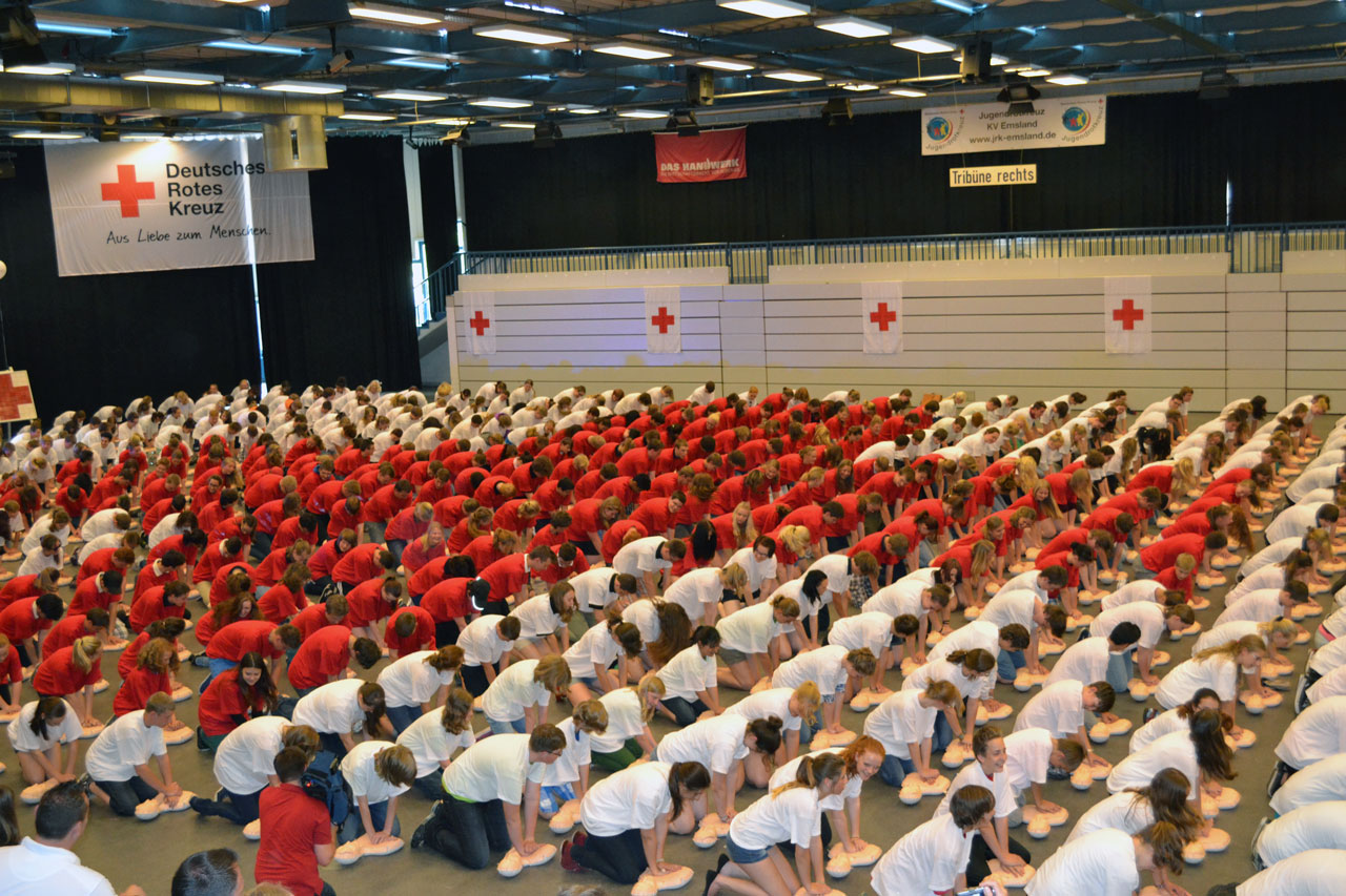 Nach einer kurzen Pause kam dann das absolute Highlight der Veranstaltung. Alle 600 Teilnehmer sollten gleichzeitig die Herzlungenwiederbelebung (HLW) durchführen. Dafür war eine ganze Halle vorbereitet worden. Anlässlich des 150 jährigen Bestehens des Roten Kreuzes bildeten die Schüler, in weißen und roten T-Shirts gekleidet, ein riesiges rotes Kreuz. Nachdem jedem ein Übungsphantom zugewiesen wurde, war es dann so weit. Unterstützt mit der passenden Musik begannen alle synchron mit ihren Maßnahmen. Das war ein super Bild und für alle ein ganz tolles Erlebnis. Nach 5 Minuten war es dann so weit: Rekordversuch geglückt!!!